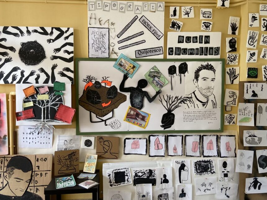 La segunda tarea del proyecto consistió en una actividad al aire libre en la que los estudiantes realizaron la tipografía ‘arbórea Font’ creada por el propio artista con madera y elementos de la naturaleza que nos rodea. El colofón del proyecto fue la visita de Chumillas: el alumnado pudo charlar y preguntar al autor sobre diversos temas para después realizar un taller creativo con dibujos. La actividad consistió en dibujar un mismo objeto y luego comparar las versiones para ver el enfoque distinto que le daba cada estudiante. Tal y como el autor recalcó, todas las posibilidades eran válidas y aportaban un enfoque complementario al de la otra persona. Asimismo, insistió en la importancia de no censurar ninguna manifestación artística y de no limitar nuestra propia creatividad.