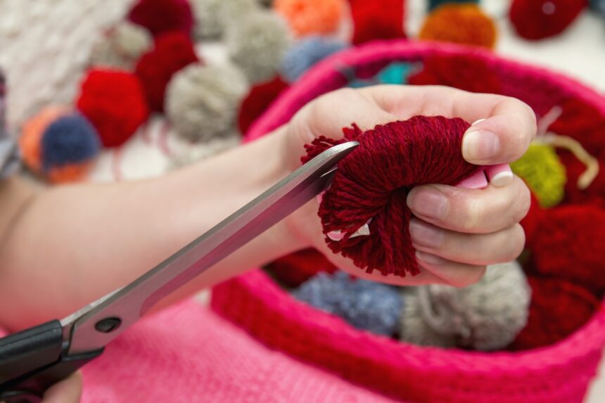 El primer paso es hacer moldes redondos de cartón para construir pompones de colores. Para ello, se recortan dos círculos iguales con un agujero en el centro, enrollando la lana alrededor y luego cortándola por el borde exterior antes de atarla bien por el centro. Una vez que los pompones están listos, se van atando uno a uno con hilo a una malla para alfombras, distribuyéndolos hasta cubrir toda la superficie y conseguir una textura mullida.