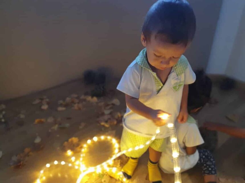 Imaginémonos un día por la mañana, los niños entran a su aula y se encuentran una provocación sensorial: una especie de mandala en el suelo formada por elementos de otoño como son hojas secas, palos, frutos típicos (granadas, mandarinas…), todo envuelto en una luz tenue y que invita a la introspección. El docente no pronuncia palabra, solamente invita a los niños a jugar e investigar esos elementos que se encuentran en el ambiente como un regalo para ellos.